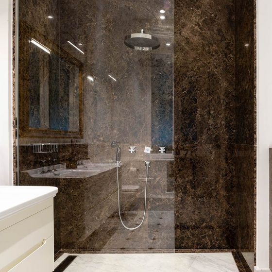 Un lavoro di ricerca e selezione di numerosi marmi utilizzati per pavimenti e rivestimenti della nuova cucina e dei nuovi bagni.