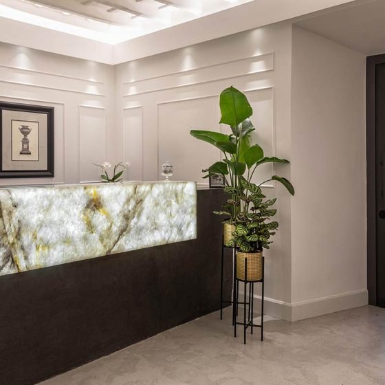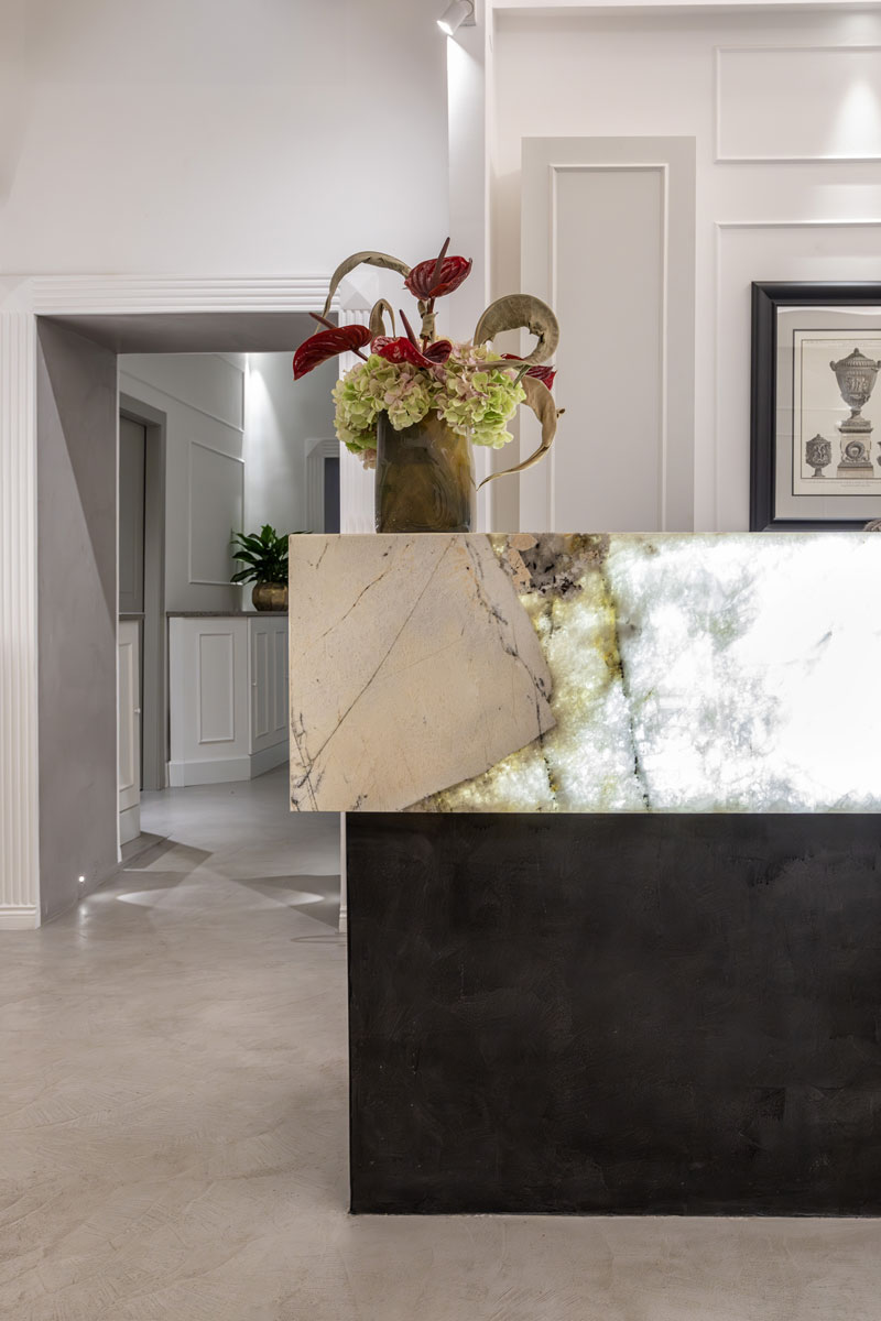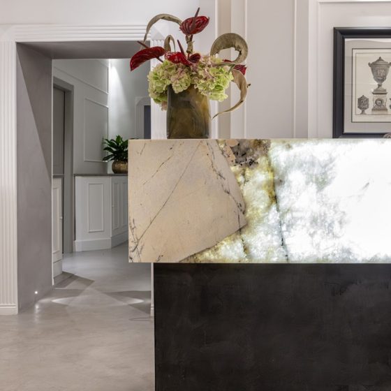 Un lavoro totalmente custom-made in linea con lo stile esclusivo dell’edificio, un progetto di restyling come partner per la ricerca, selezione e fornitura di materiali diversi: superficie continua, marmi e quarziti.