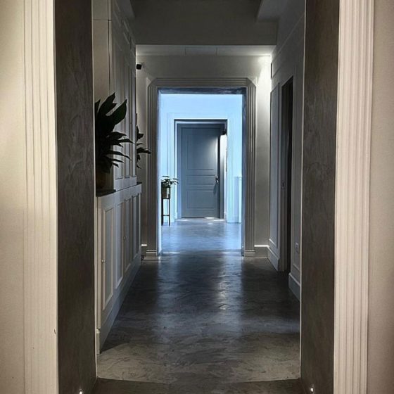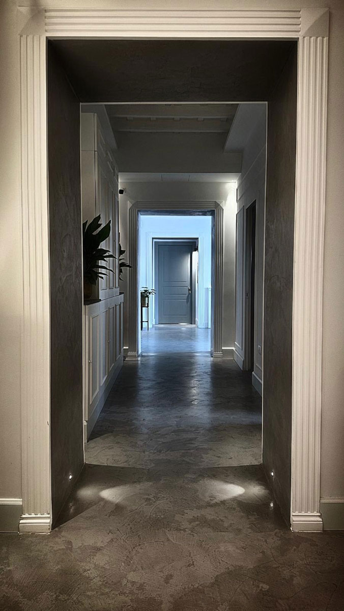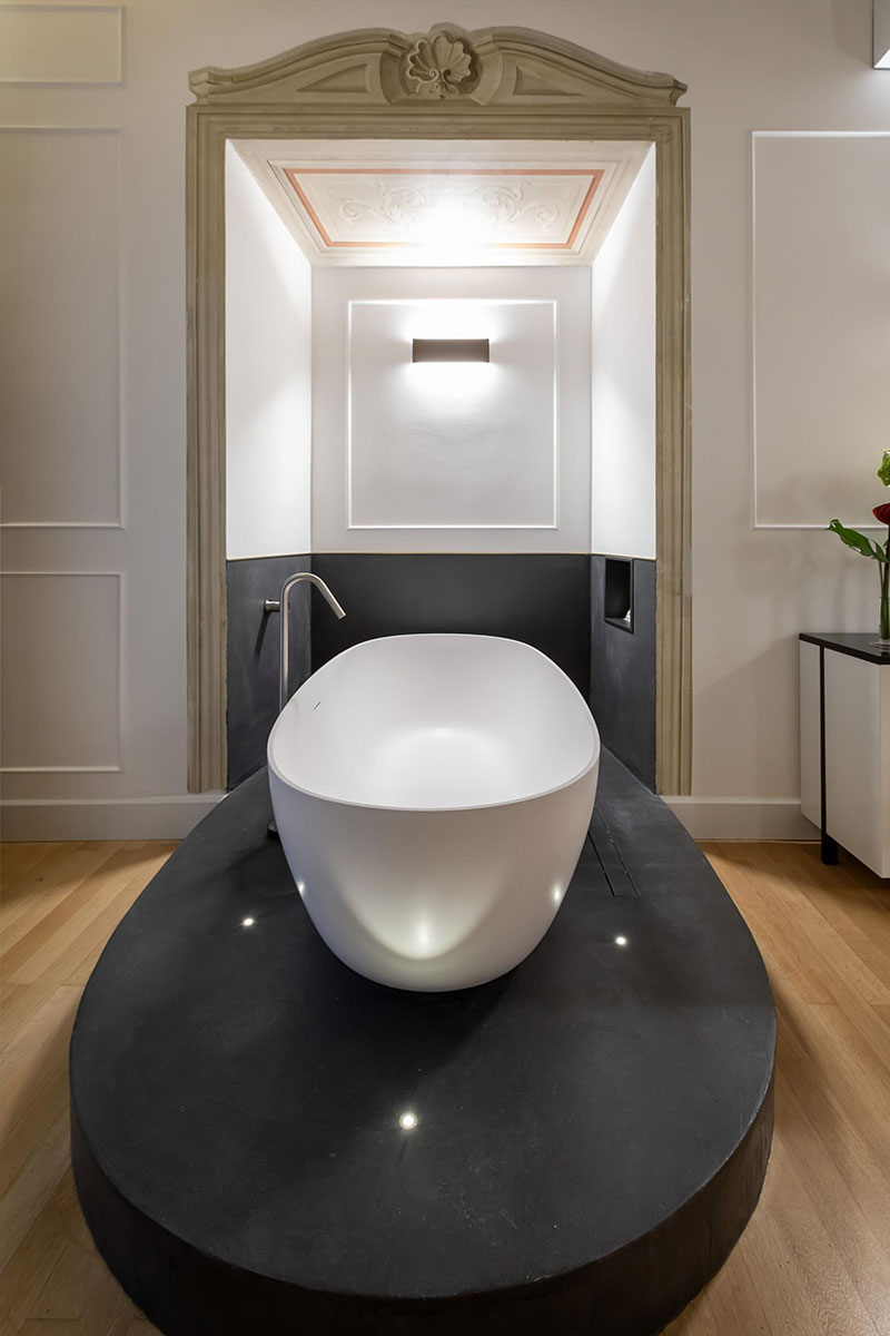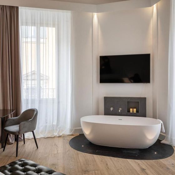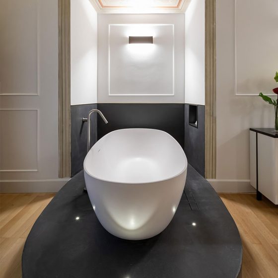 La superficie continua priva di fughe e dall’effetto materico è presente in numerose parti della struttura, sia nelle hall che nei corridoi, nello specifico, il sib hardcrete a basso spessore delle Concrete Solution lavorata dall’azienda Trattamento pavimenti. Lo stesso materiale dal fascino materico in total black è utilizzato anche come finitura per la base delle vasche ellittiche free standing presenti nelle suite.