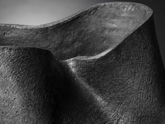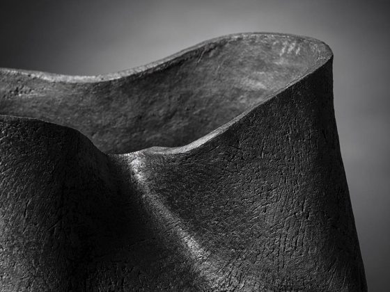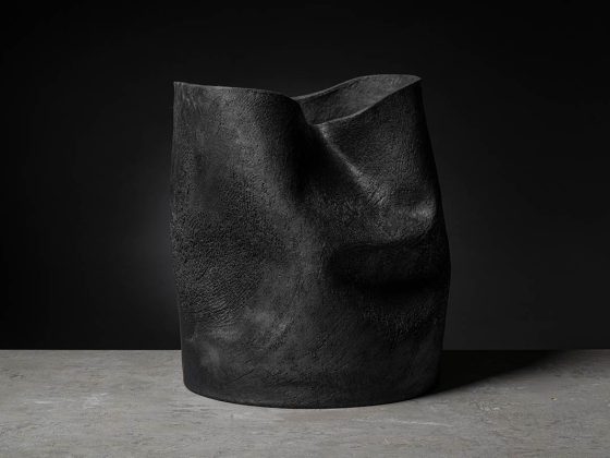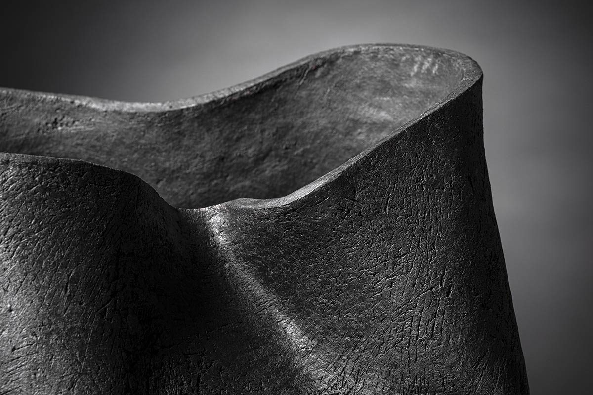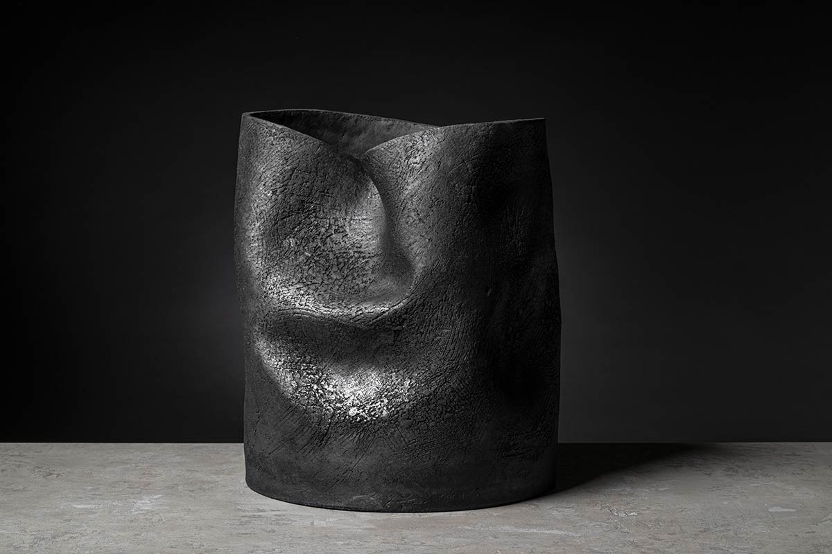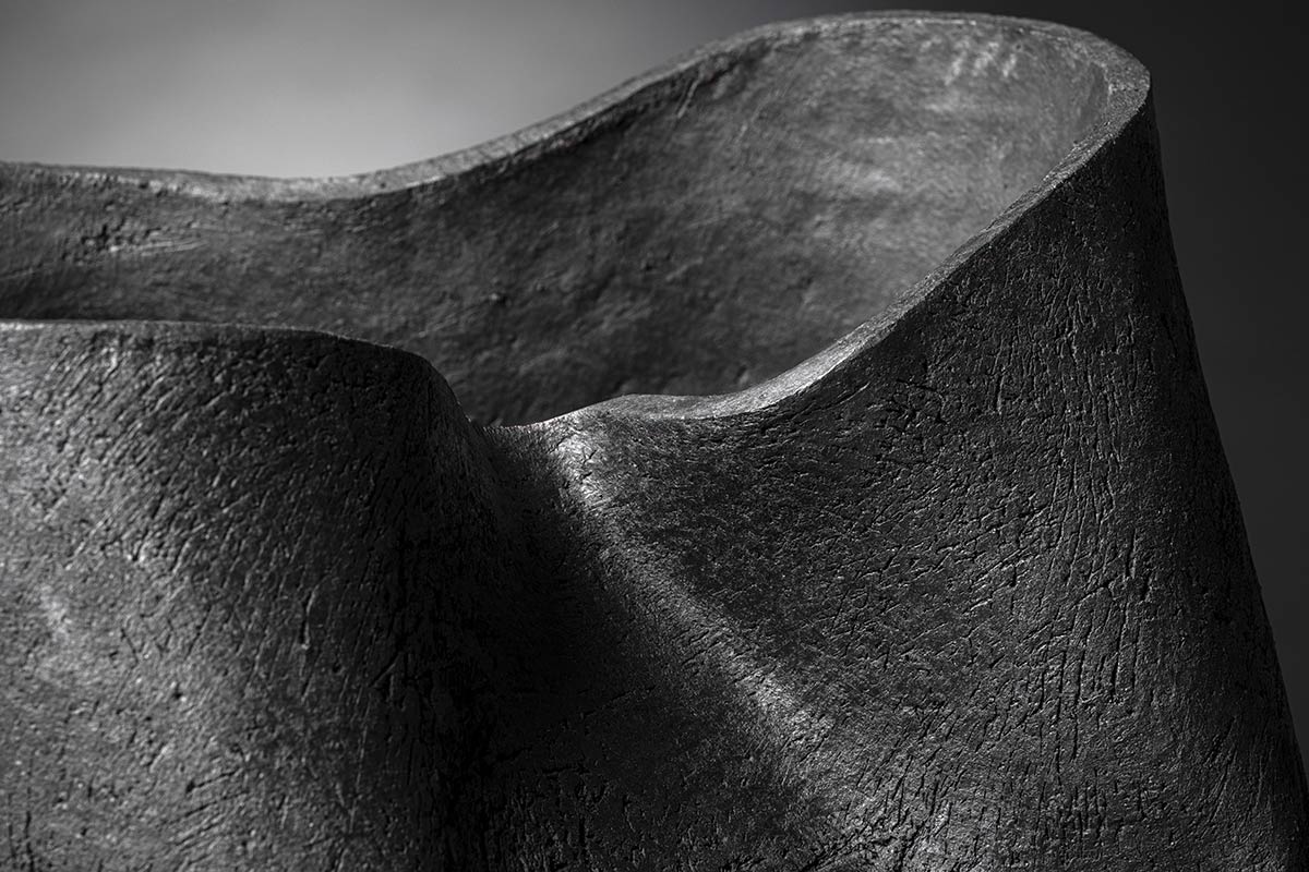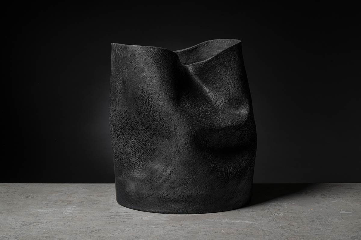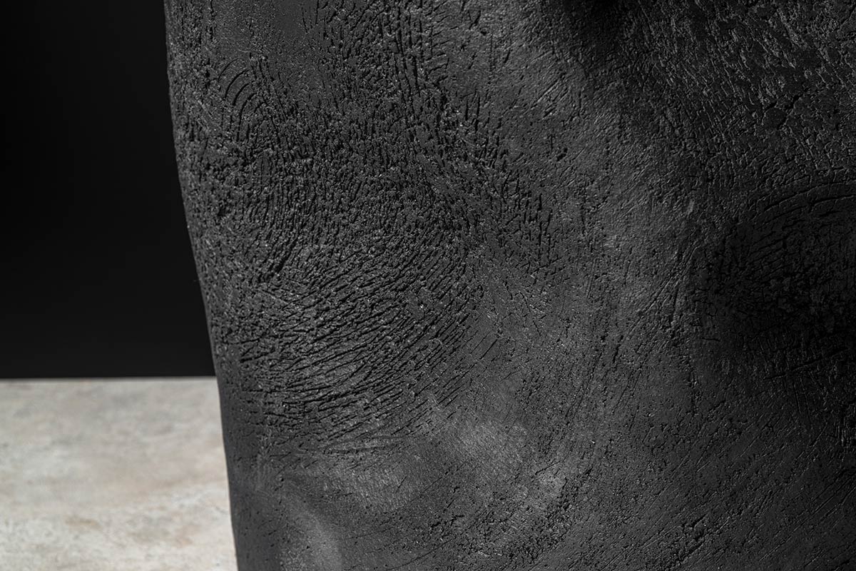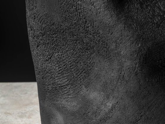 Il nuovo vaso mette in valore il gesto manuale del designer che a scopo decorativo sembra lasciare la sua impronta sulla superficie del bucchero, ruvida e dalla finitura materica.