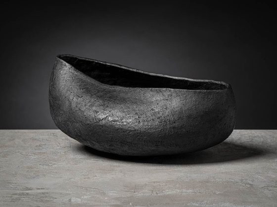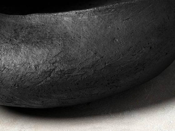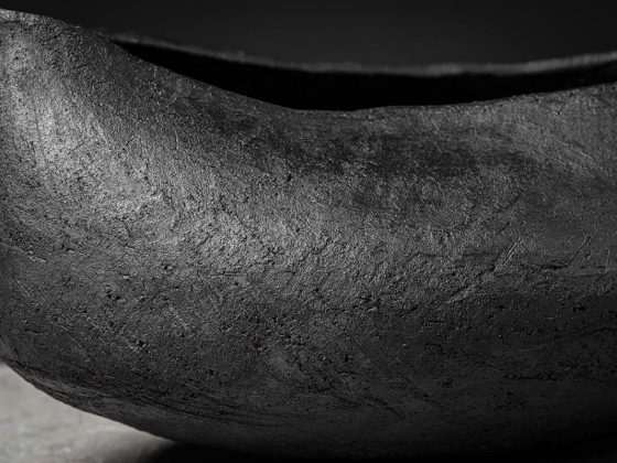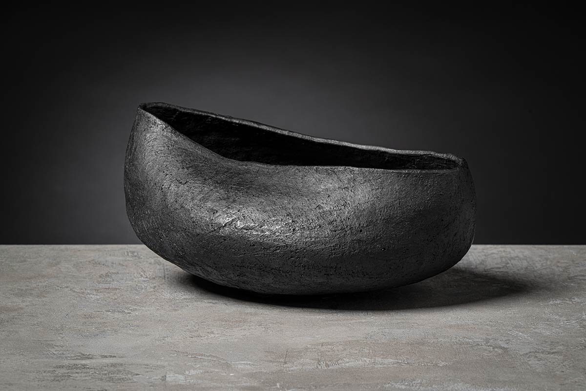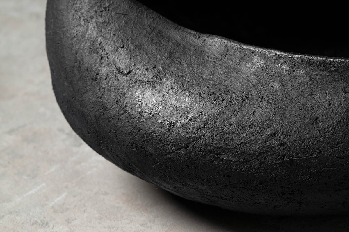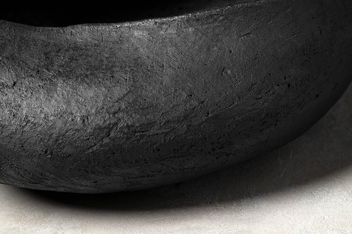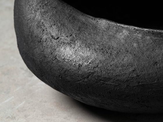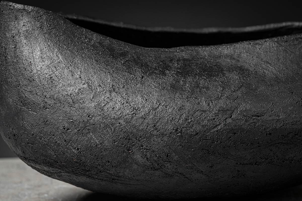 La silhouette irregolare valorizza il design della ciotola e centrotavola modellata dalla sapienza artigiana: il gesto manuale del designer lascia il segno sulla superficie levigata del bucchero. Le pareti del centrotavola sono modellate con gesto deciso, quasi ricurve su se stesse a creare un guscio protettivo dove custodire gli oggetti più cari.