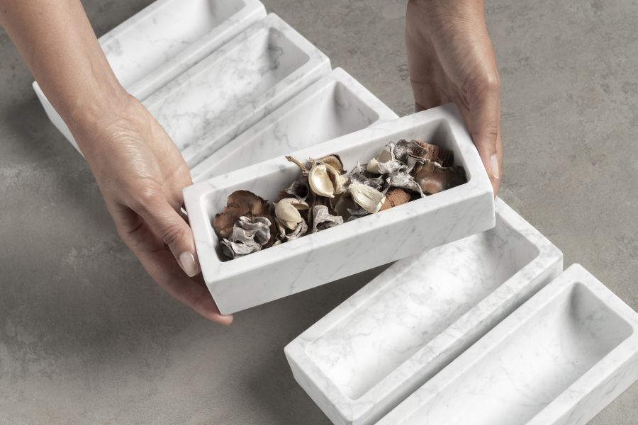 In cucina abbiamo porta spezie, porta utensili, barattoli, centrotavola, vasi, svuota tasche e orologi in marmo, particolarmente scelto il marmo Bianco di Carrara.