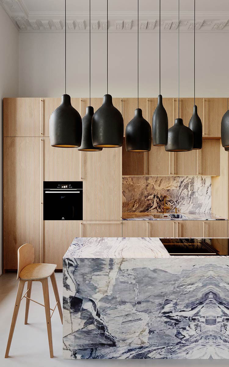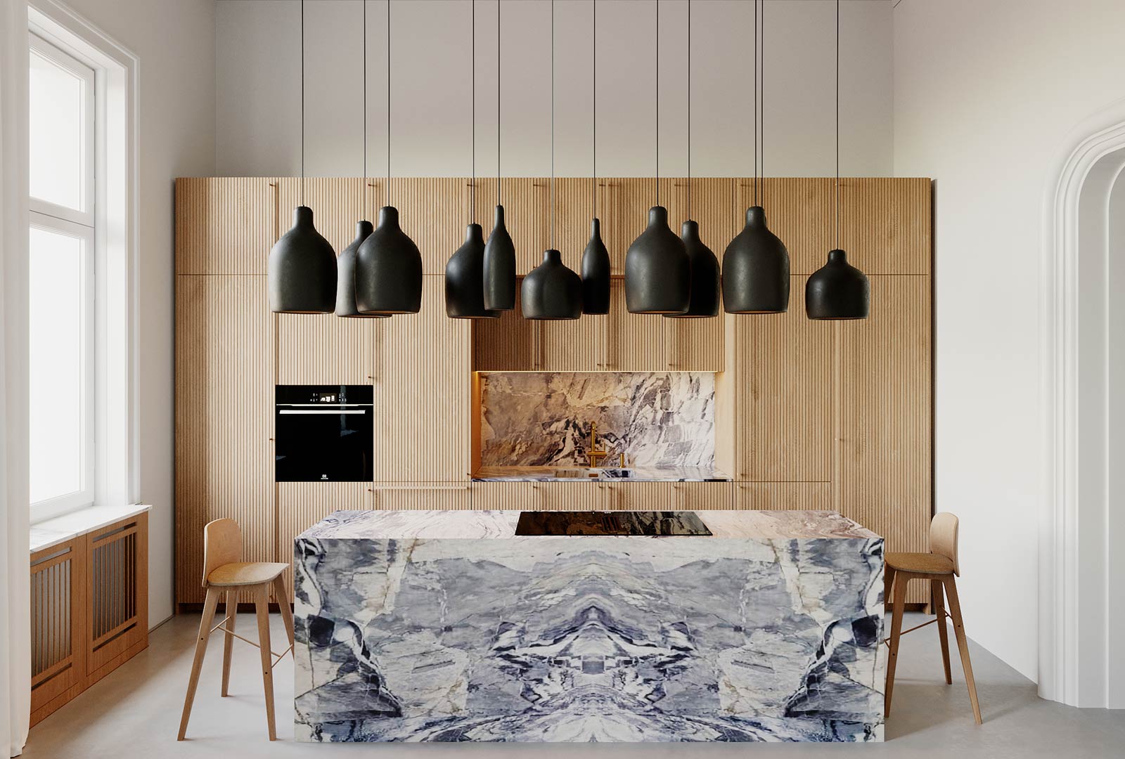 Dall’effetto sorprendente, il marmo blu si impiega anche per realizzare i top cucina, conferendo unicità all’ambiente, con le sinuose venature tipiche del prezioso materiale che arredano lo spazio grazie alla sua intensità cromatica, accompagnando i gesti della quotidianità.