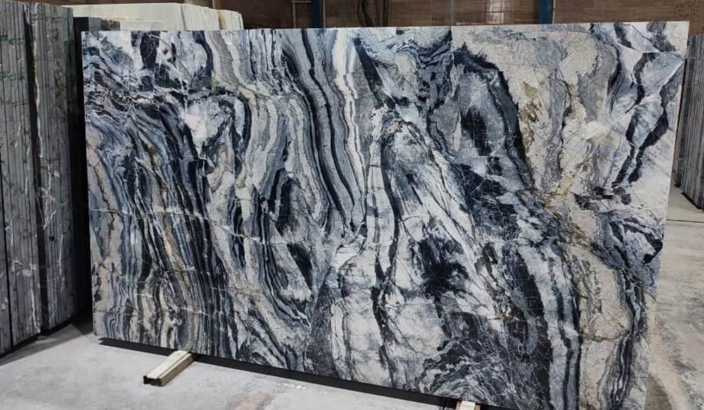 Un territorio, quello dell’antica Persia, che sembra fuori dal tempo, laddove i profili rosso fuoco delle catene montuose, si stagliano sui pendii delle cave di marmo. Le caratteristiche striature tinte di blu creano texture originali che ipnotizzano lo sguardo, indagando fin nell’anima autentica di questo materiale raffinato. Seguendone le trame, ci si addentra in un mondo sospeso tra le Mille e una notte e le tracce di grandi culture, da Zoroastro ai re mongoli, spingendosi sulla via della Seta.