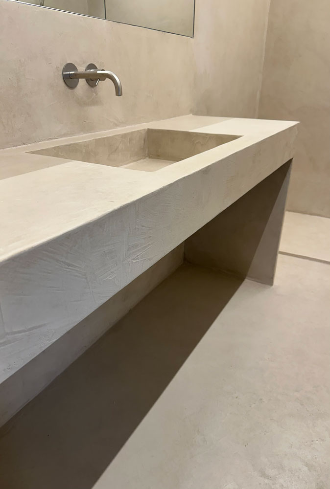 Numerosi gli ambienti personalizzati in microcemto, dai pavimenti ai rivestimenti insieme ai lavabi dei bagni rivestiti in colori diversi utilizzando basi in peperino.