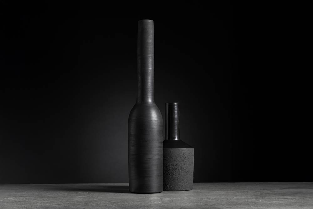 BOUKÀLI E KÒLYMA propongono una visione anticonformista della più classica bottiglia, frutto di sperimentazione, dove il bucchero è protagonista nelle sue differenti finiture, liscia e più ruvida comunicando l’eleganza cromatica e la forza materica in un incontro di arte e design.