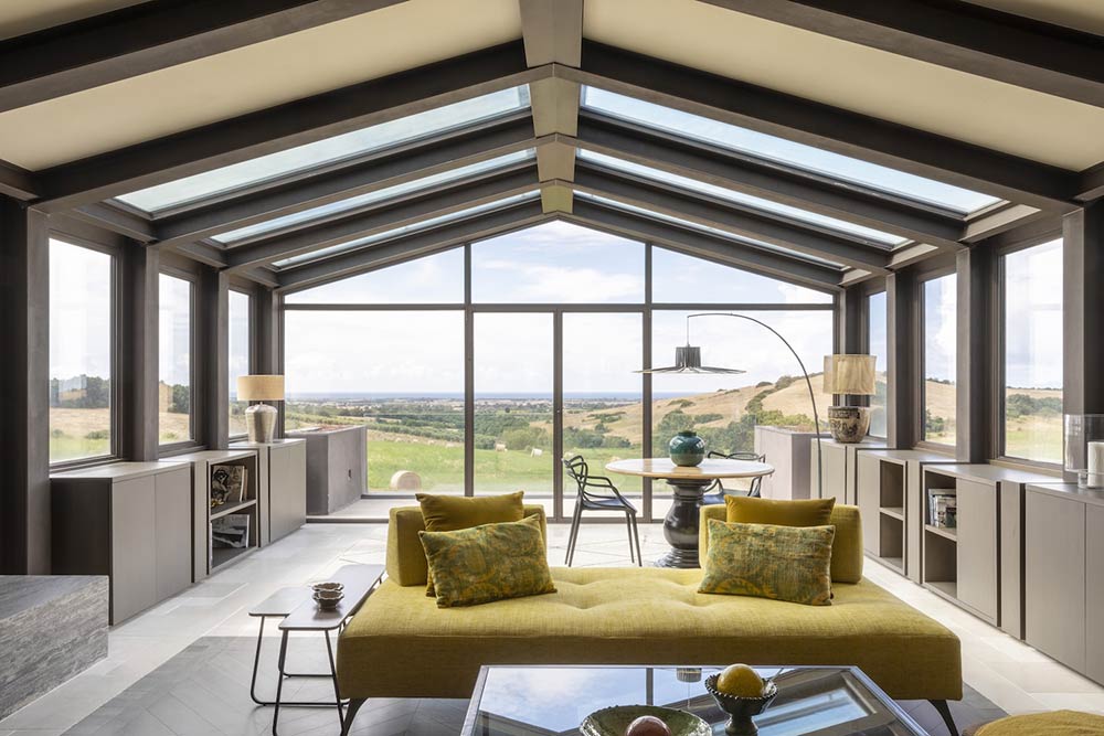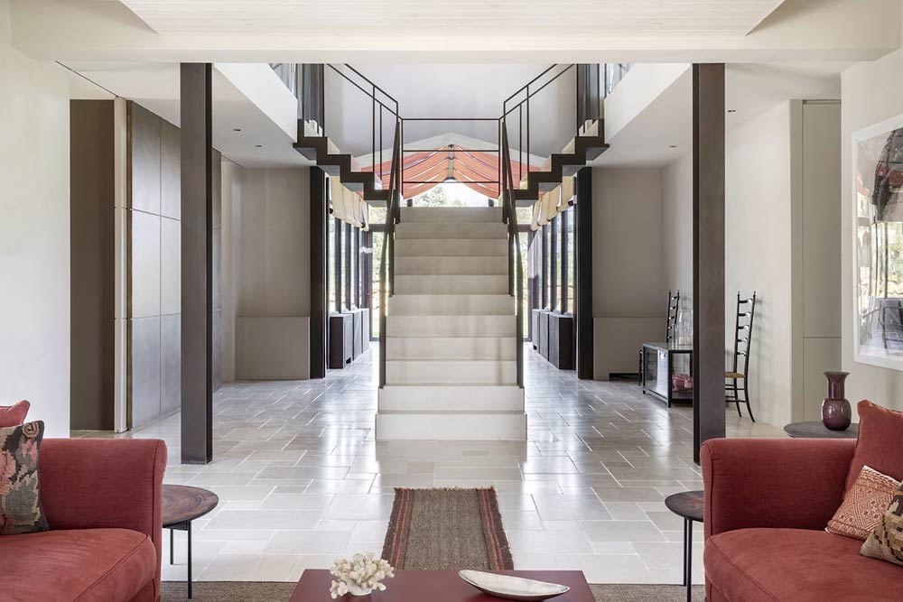L’impatto estetico notevole è dato dall’estrema matericità della superficie della pietra, con le sue venature come “segni” impressi dallo scorrere inesorabile del ciclo della natura. La pavimentazione in pietra di Trani entra in dialogo con la scala scultorea, elemento di raccordo e unione tra i diversi livelli del casale, accogliendo il paesaggio esterno che flirta con l’interior design grazie a scorci panoramici.